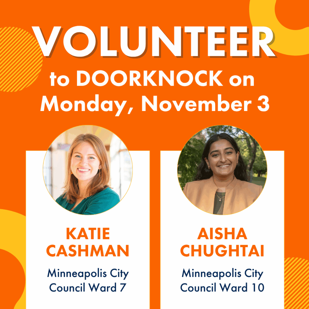 Let’s help get out the vote for pro-transit candidates! Join us to doorknock for Katie Cashman (Minneapolis City Council Ward 7) and Aisha Chughtai (Minneapolis City Council Ward 10) from 5:30 to 7:30 pm on November 3. No experience necessary!