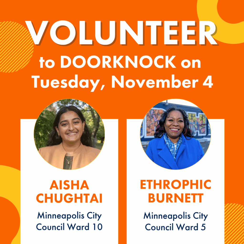 Let’s help get out the vote for pro-transit candidates! Join us to doorknock for Aisha Chughtai (Minneapolis City Council Ward 10) and Ethrophic Burnett (Minneapolis City Council Ward 5) from 11 a.m. to 1 p.m. on November 4. No experience necessary!